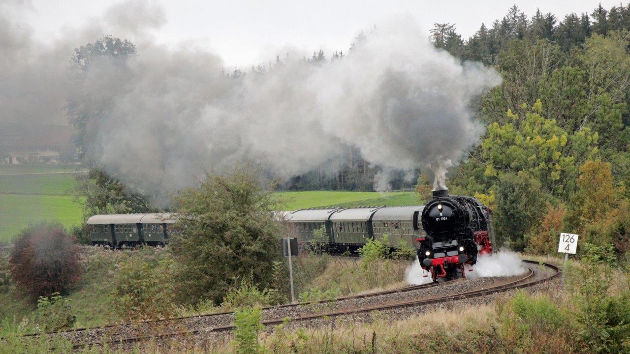 3 Tage Schnellzugdampf mit der derzeit größten betriebsfähigen Dampflok in Deutschland, mit der 01 1104 über rund 1400 km durch Bayern. Vom Frankenland durch alle Bezirke Bayerns ans Schwäbische Meer und zurück mit einem kleinen Abstecher durch Hessen. Inklusive Übernachtungen in Augsburg und Ulm.