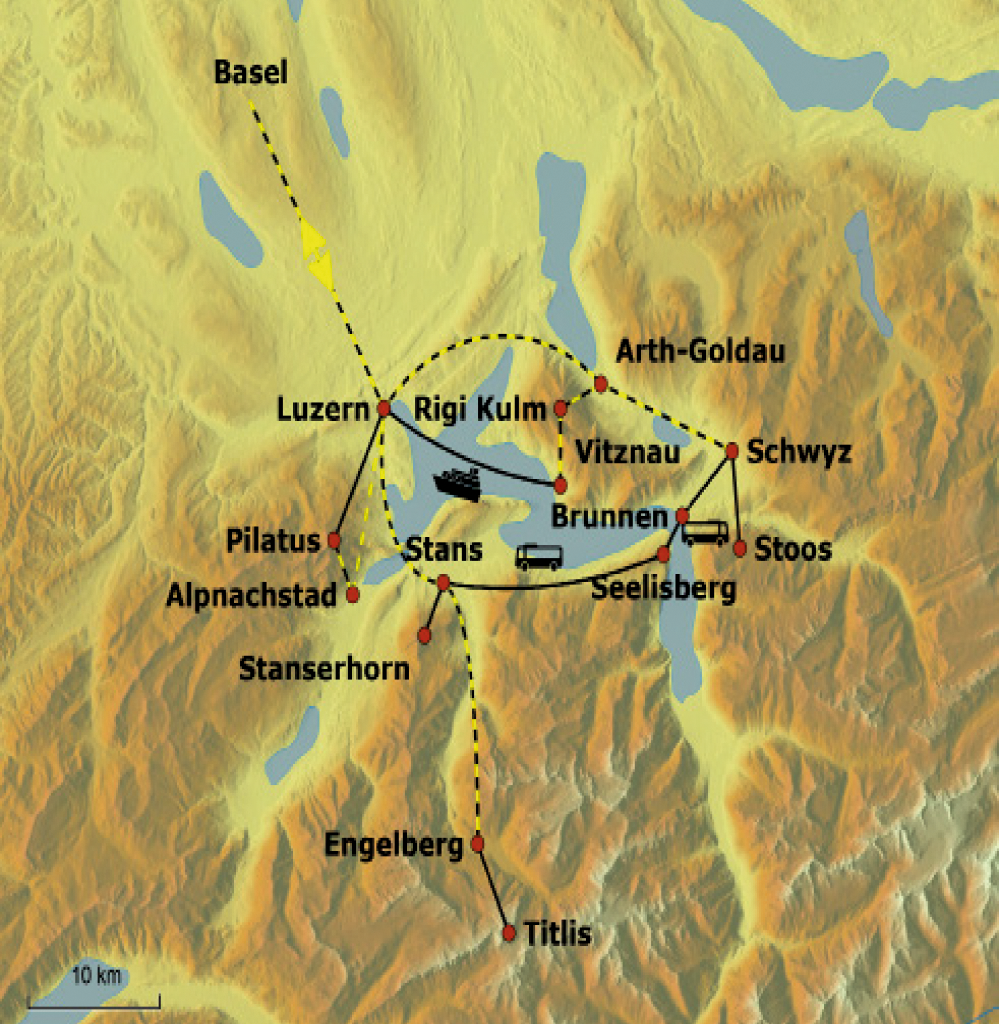 Mit der Bahn und einer kurzen Busfahrt erreichen wir die Talstation der Stoosbahnen. Die Standseilbahn Schwyz – Stoos und die Luftseilbahn Morschach – Stoos erschließen das autofreie Bergdorf Stoos – und das gleich mit einem Weltrekord! Die Standseilbahn von Schwyz nach Stoos ist die steilste der Welt. Ein technisches Wunderwerk, das bereits die Anreise zum Erlebnis macht. Angekommen auf dem Stoos eröffnet sich uns ein traumhaftes Bergpanorama. Talwärts geht es nach Morschach und mit dem Bus nach Brunnen am Vierwaldstättersee. Eine kurze Seeüberquerung mit dem Schiff bringt uns nach Treib. Mit der Treib-Seelisberg-Bahn, einer elektrischen Standseilbahn, erreichen wir das Bergdorf Seelisberg. Bekanntester Ortsteil der Gemeinde ist sicherlich das Rütli gemäß mythischer Überlieferung die Gründung der Schweiz stattfand. Luzern erreichen wir am Nachmittag per Bus und Schmalspurbahn ab Stans. Der Abend in Luzern steht zur freien Verfügung.MONTAG, 1. JUNI 2026 (F)