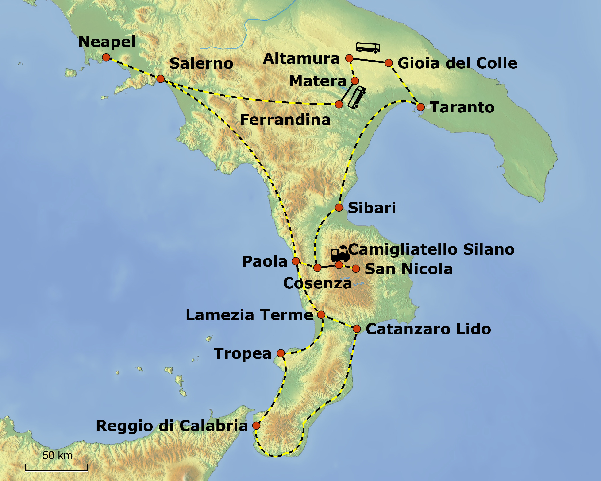 und im bergigen Hinterland sowie auf einer beeindruckenden Dampfzugfahrt ins kalabrische Sila-Gebirge. Während eindrucksvoller Städtetouren kommen Eisenbahn- und Kulturbegeisterte gleichermaßen auf ihre Kosten.